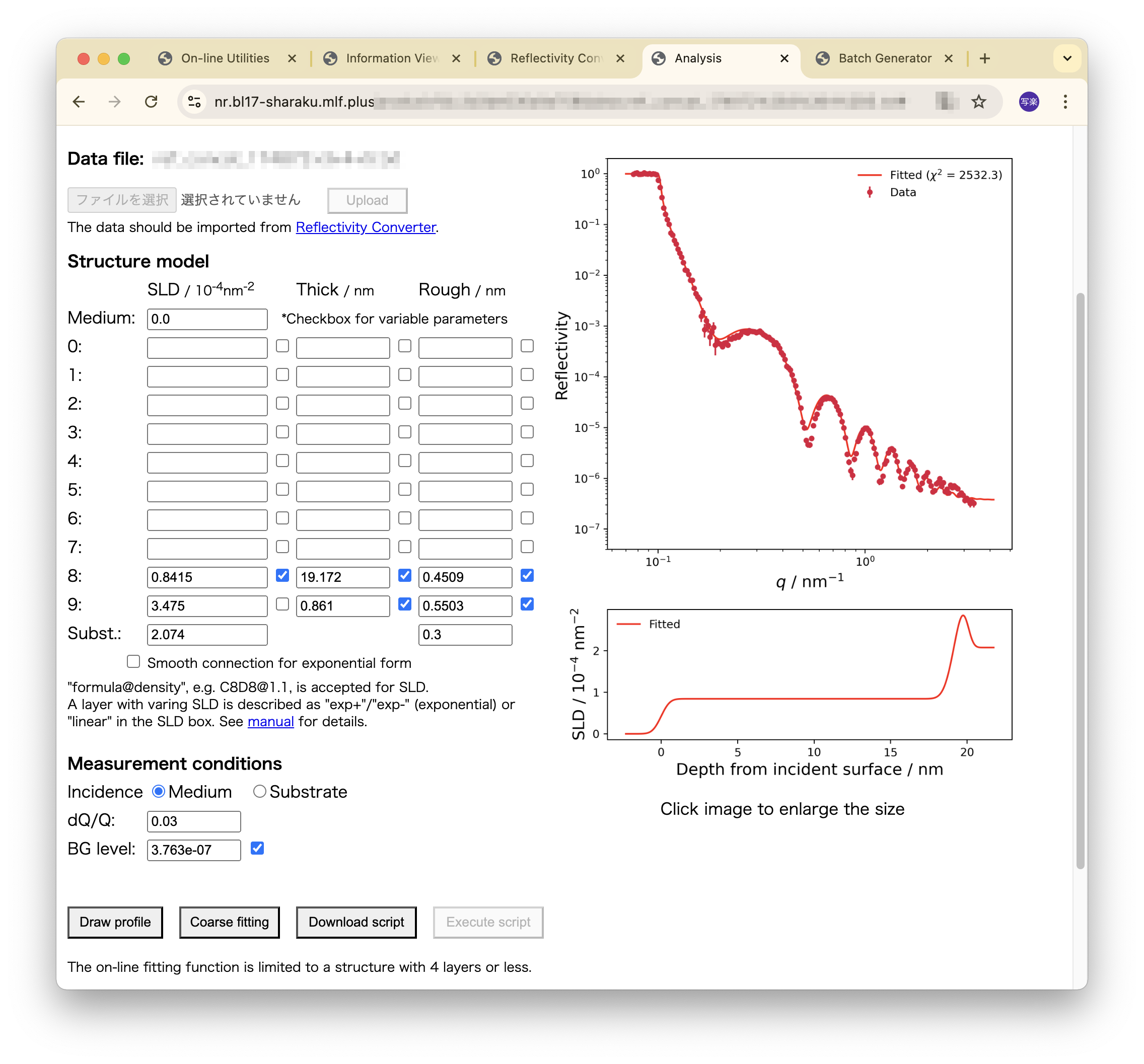 BL17では中性子反射率実験に関する理論計算やデータ閲覧など様々な処理を行うことができる中性子反射率クラウドを公開しており、そこで実験後のデータ解析も行うことが可能です。